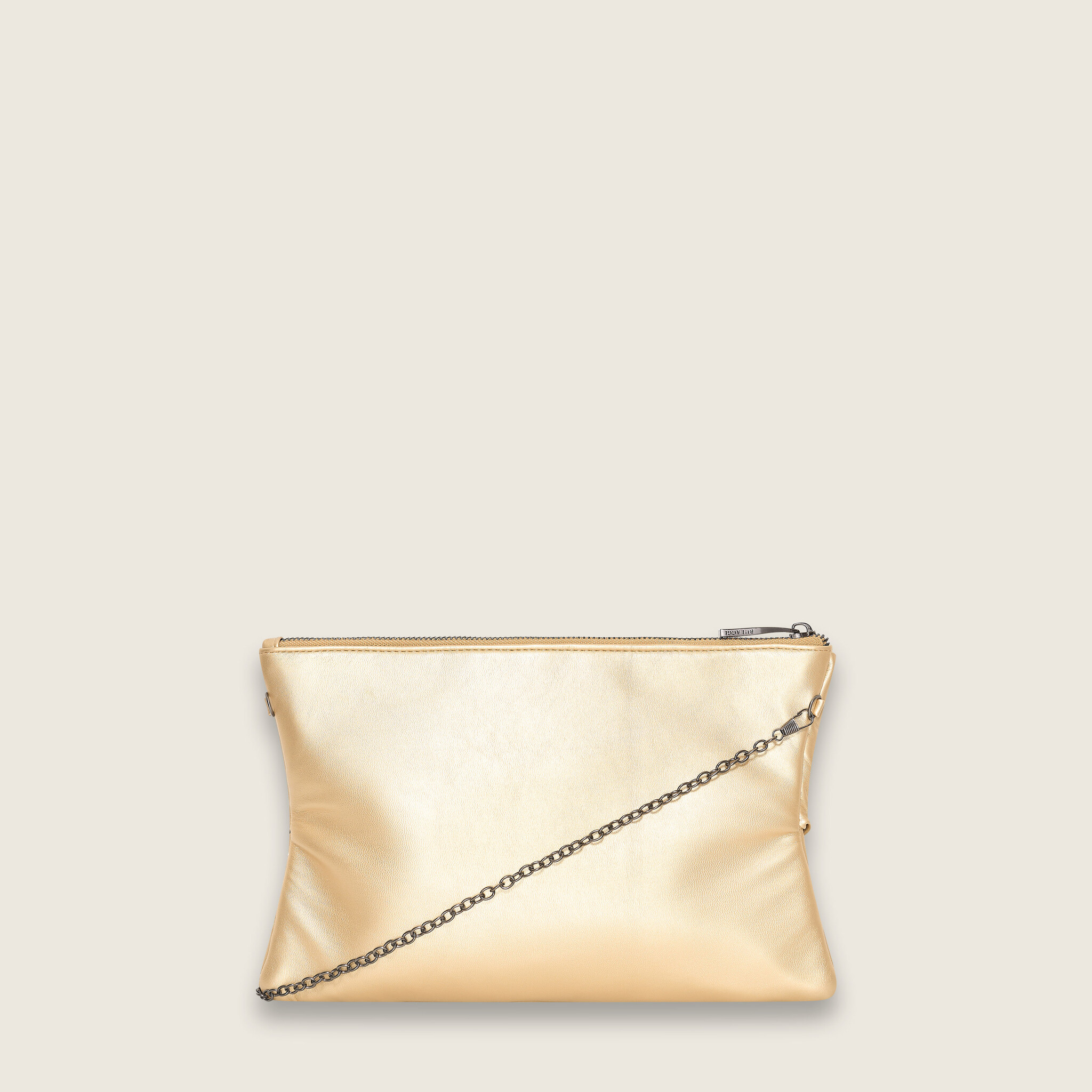 This striking gold Bow clutch, is a large cluch bag in which many essentials can fit during your night out. This crossbody bag has a non adjustable shoulder chain. Because of the additionally supplied shoulder strap, this bag can be worn in many ways. On the interior, this bag has one main compartment with one slip pocket. The bag can be closed with a zipper. The colour of the hardware of this bag has a dark anthracite colour. The sizes (widht x height x depth) of this bag are 29x19x7