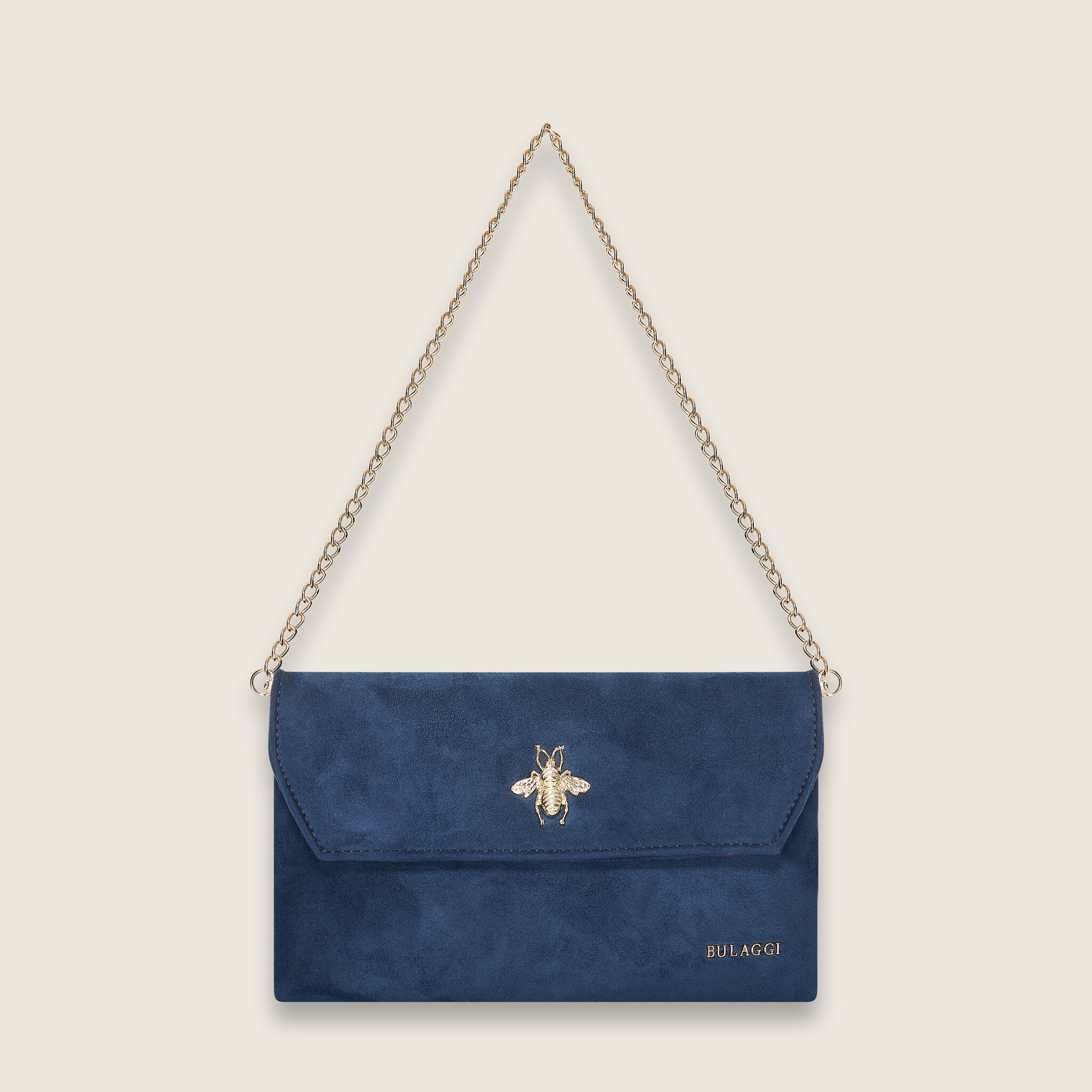 This casual chic dark blue Carnation envelop, is a large cluch bag in which many essentials can fit during your night out. This crossbody bag has a non adjustable shoulder chain. Because of the additionally supplied shoulder strap, this bag can be worn in many ways. The bag has a spacious main compartment and two relatively small inner pockets, of which one with a zipper. This bag closes with magnetic clasp closure. The colour of the hardware is gold. The sizes (widht x height x depth) of this bag are 26x16x3