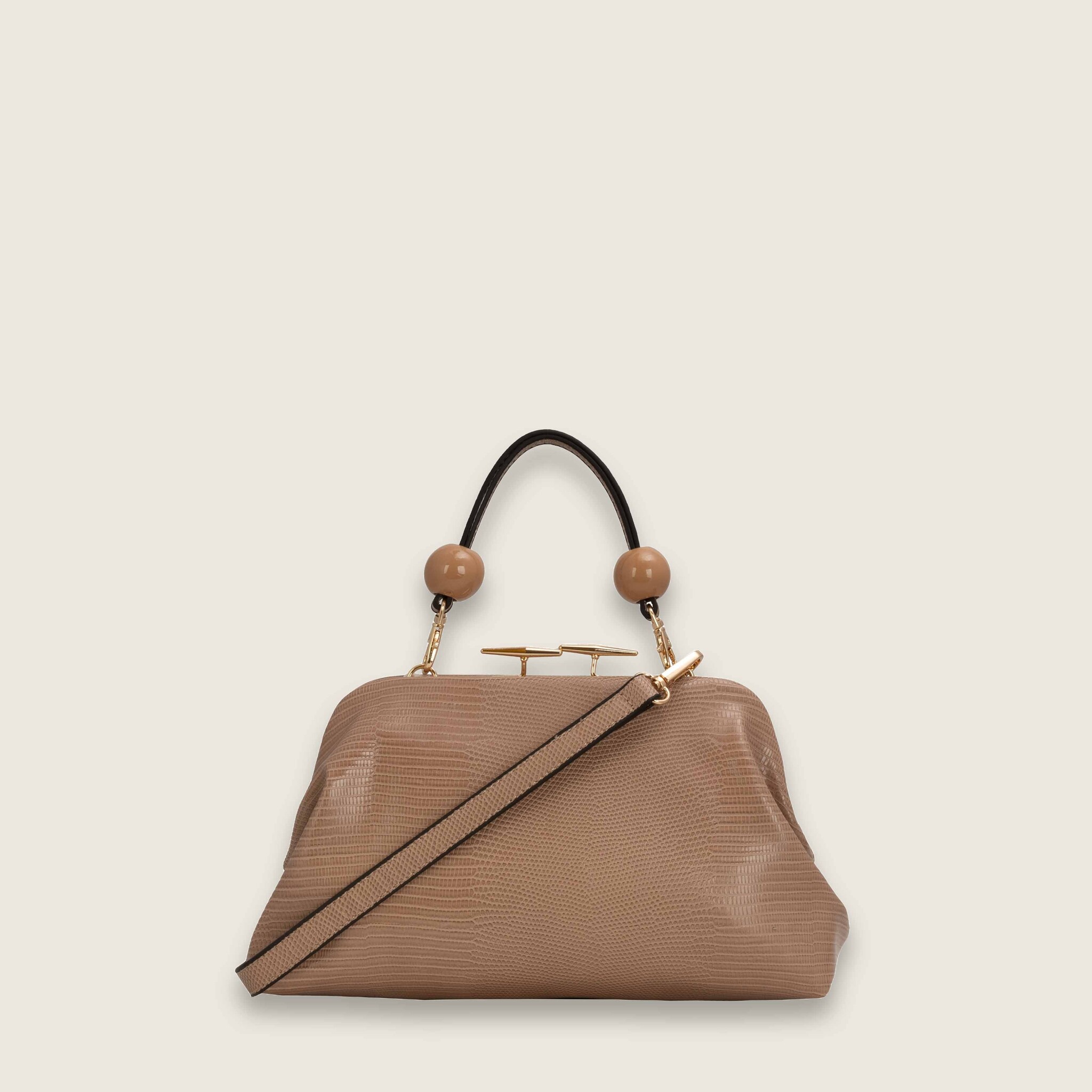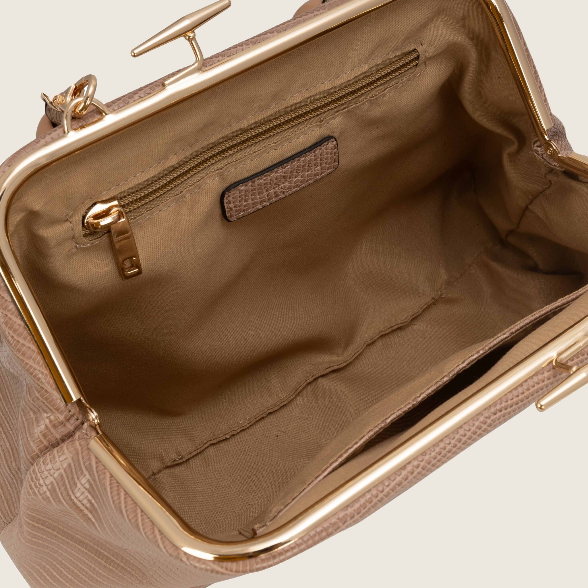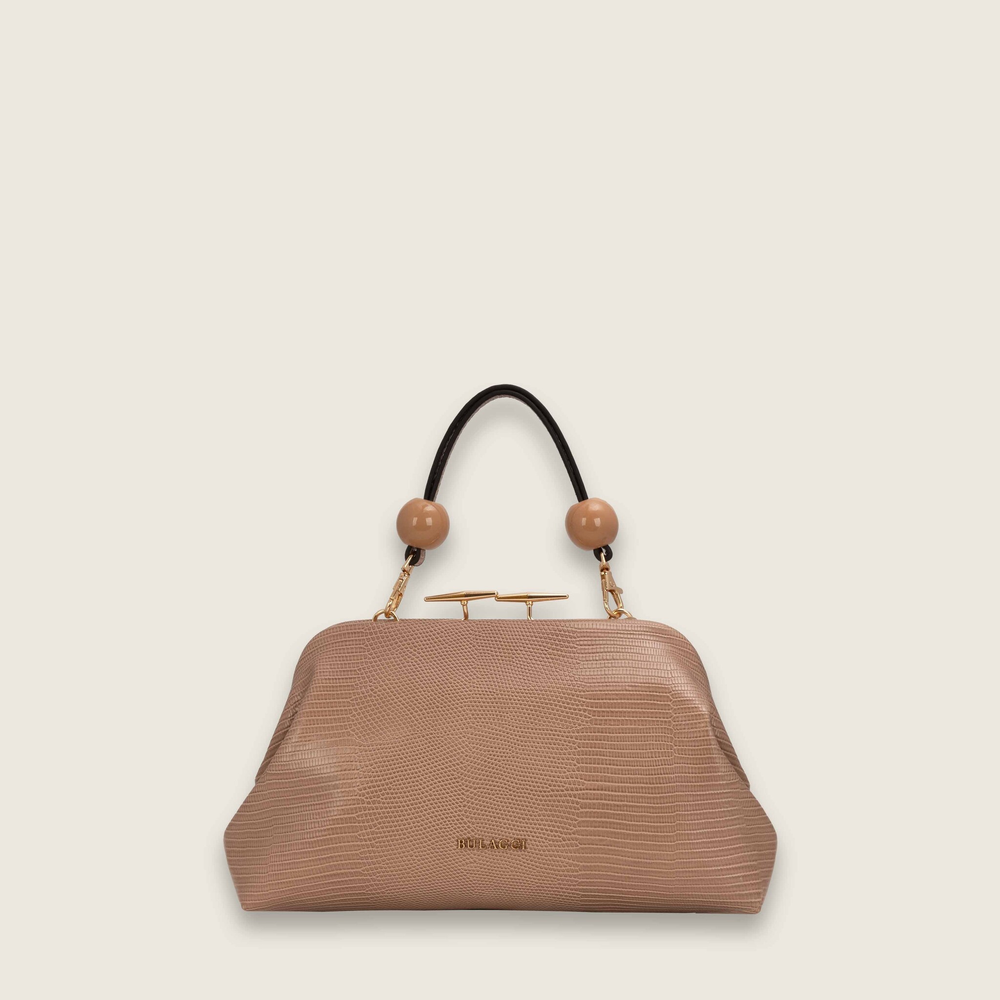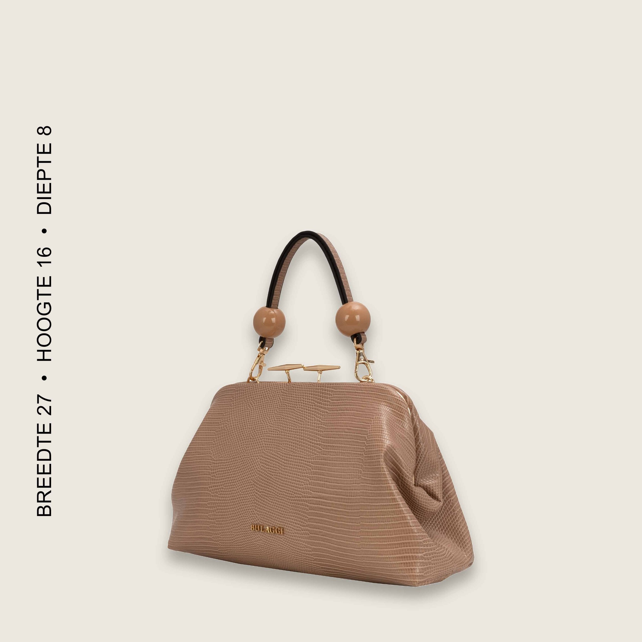 This compact Biscuit , has a unique look with a beautiful print. The bag has a non-adjustable shoulder chain. Thanks to the additionally supplied long (adjustable) and detachable shoulder strap, the bag can be worn in different ways. The bag has a spacious main compartment and two relatively small inner pockets, of which one with a zipper. The bag can be closed with a clasp closure. The colour of the hardware is gold. The sizes (widht x height x depth) of this bag are 27x16x8