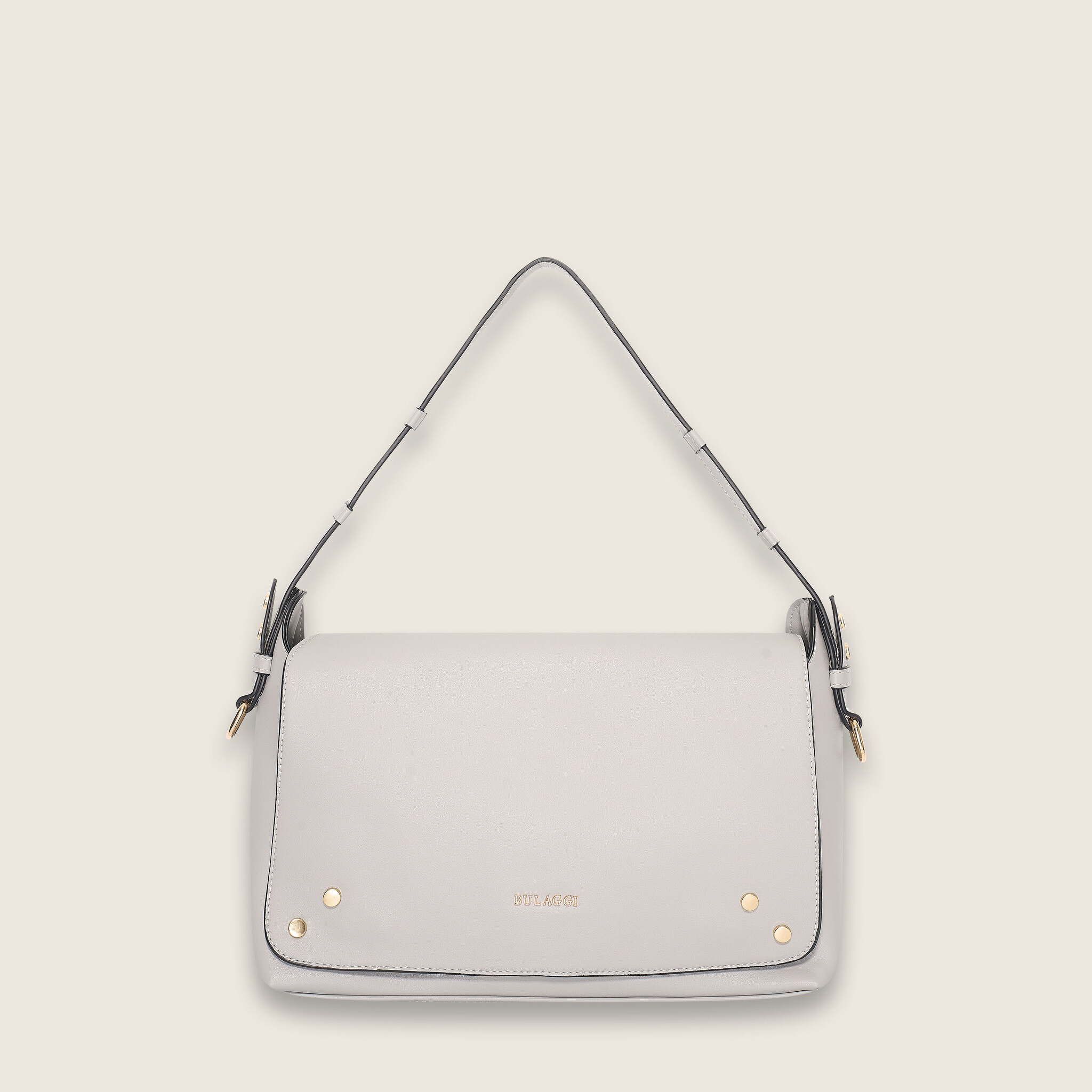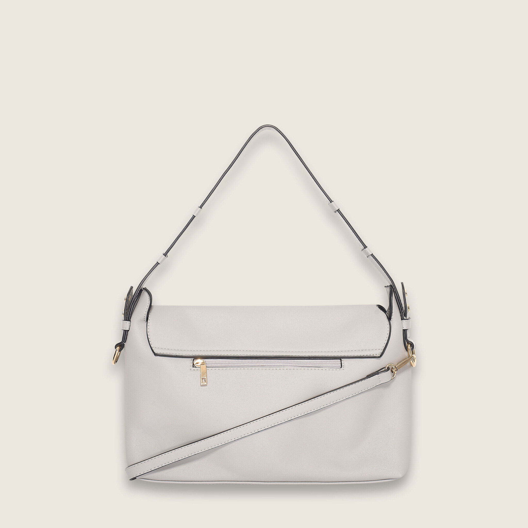 This modern light grey Isa shoulderbag, is a perfect bag for daily use. This handbag has one strap and wears comfortably in the hand and can be worn over the shoulder. Thanks to the additional shoulder strap, this bag can be worn over the shoulder too.The bag has two compartments of which one closes with a zipper. There is also a zip pocket on the back side of the bag. This bag closes with a flap with magnetic clasp closures. The colour of the hardware of this bag is light gold. The sizes (widht x height x depth) of this bag are 30,5x19x9,5