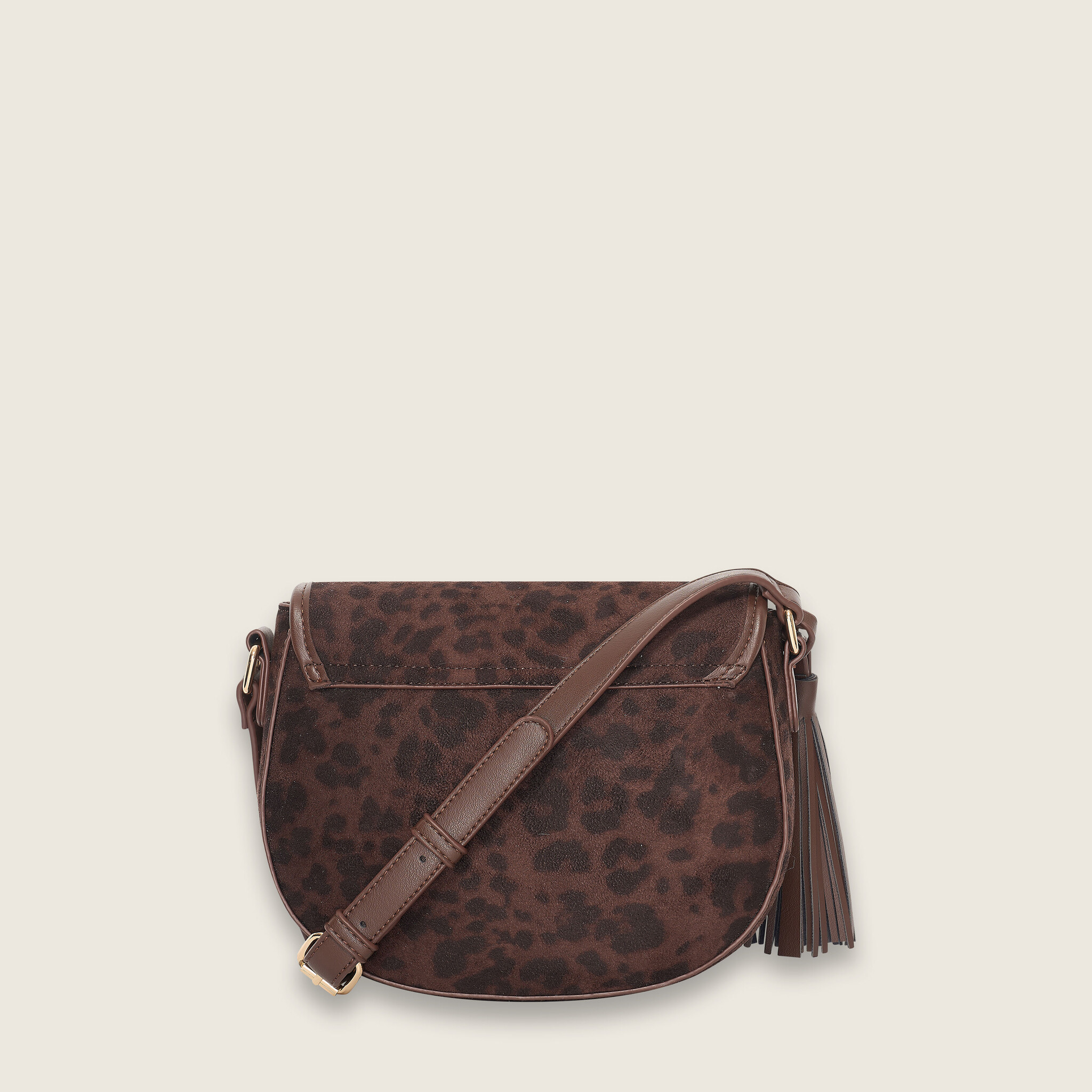 This modishbrown Leopard saddle bag, is both chic and casual and therefore can easily be combined with different outfits. With this bag, you will receive an adjustable shoulder strap. This way you do not only have to hold this bag in your hand, but you can also wear it over the shoulder. The bag has a spacious main compartment and two relatively small inner pockets, of which one with a zipper. The bag closes with a flap and a push button. The colour of the hardware is gold. The sizes (widht x height x depth) of this bag are 22x18x8