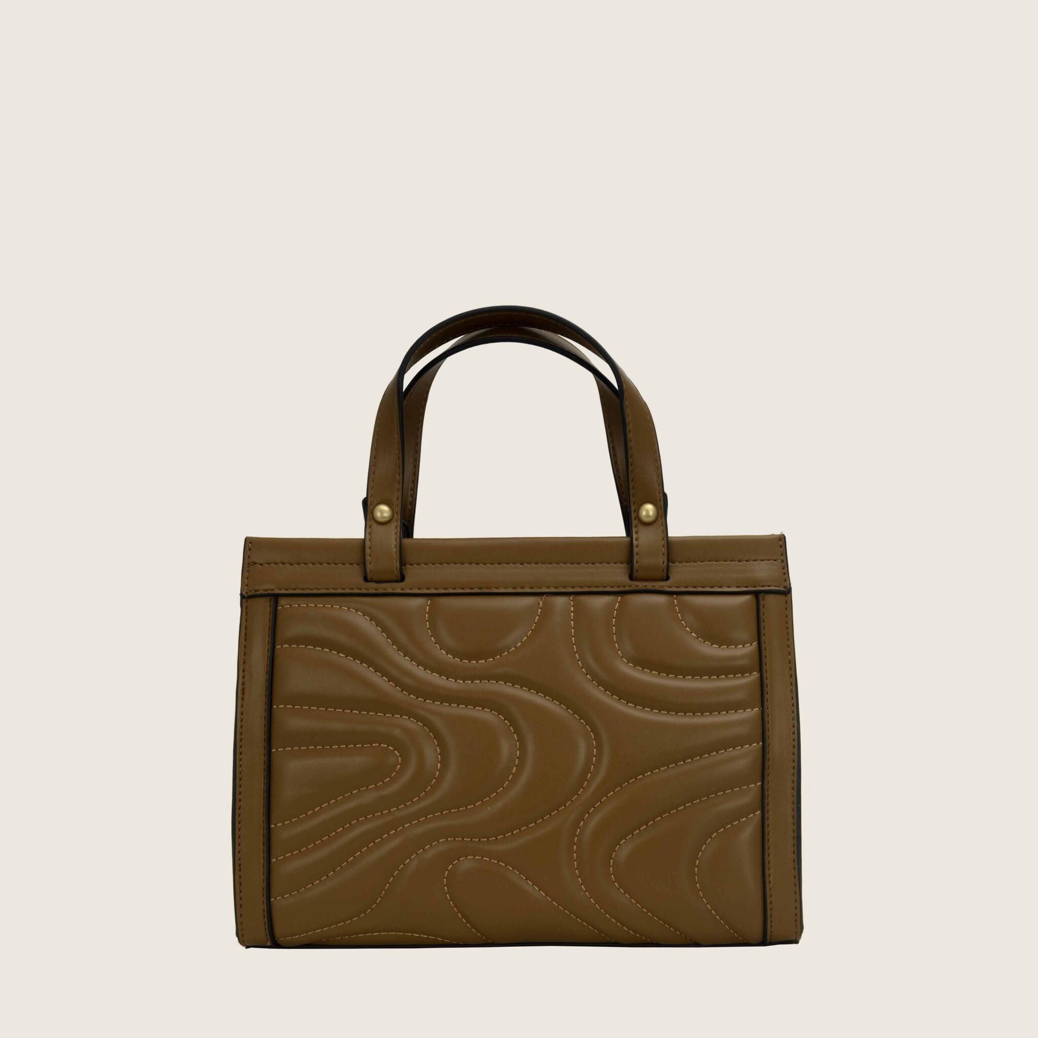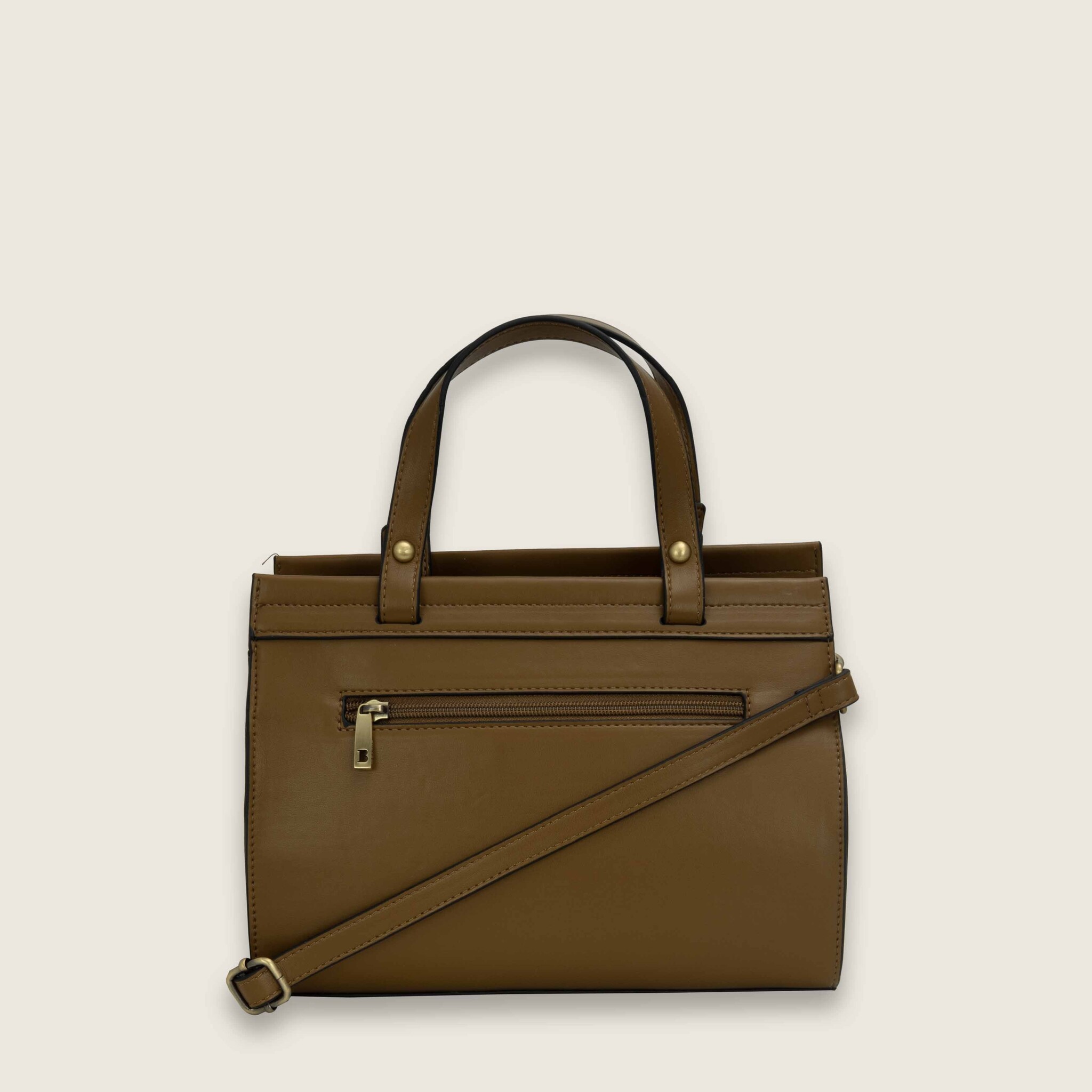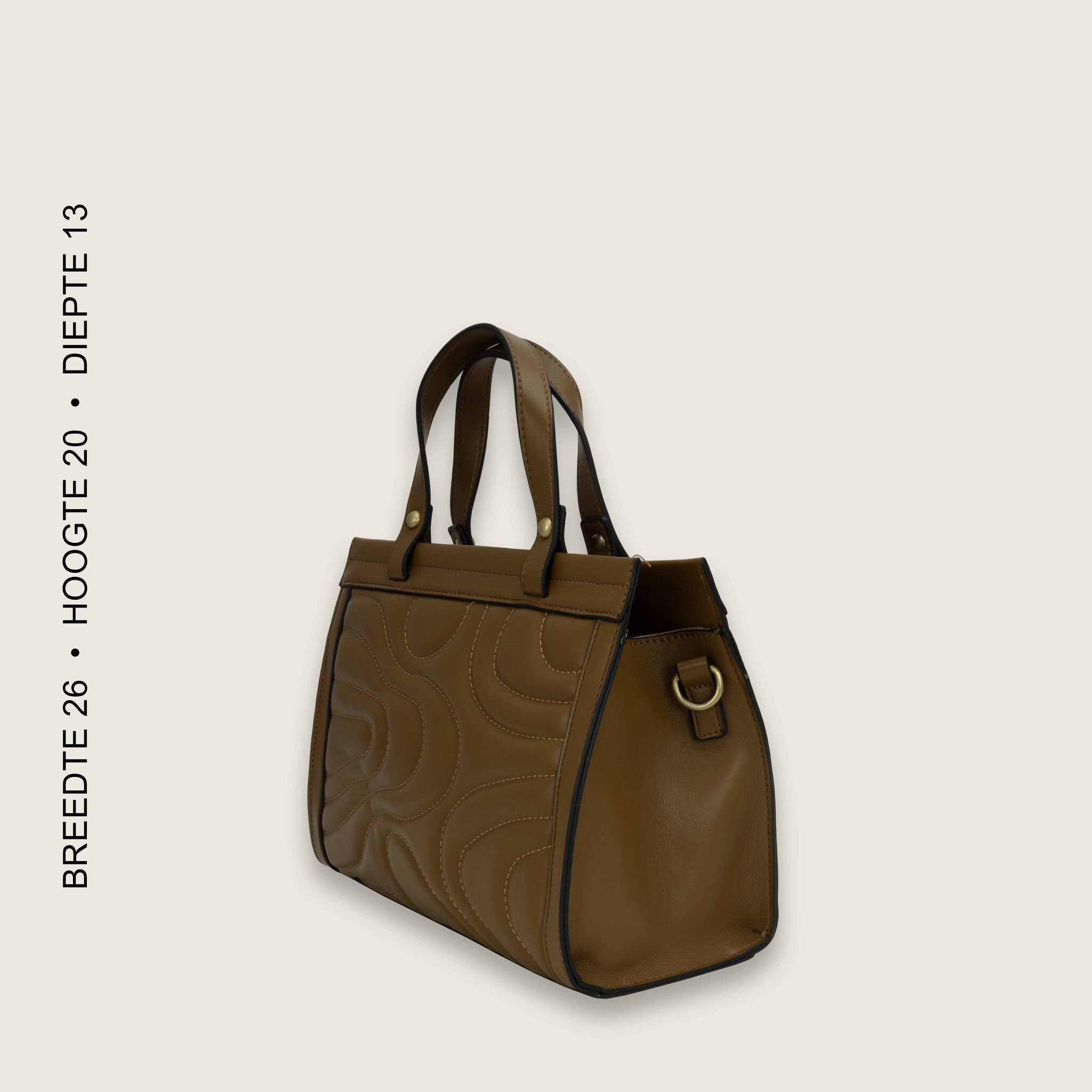 This practical Khaki , is both chic and casual and therefore can easily be combined with different outfits. This bag has double handles and carries comfortably in the hand. Thanks to the additionally supplied long and detachable shoulder strap, the bag can be worn in different ways. The bag has a main compartment and two inner pockets, of which one with a zipper. This bag has a back zip pocket. The bag can be closed with a zipper. The colour of the hardware is called 'antique brush' and has a messing colour, like polished gold. The sizes (widht x height x depth) of this bag are 26x20x13