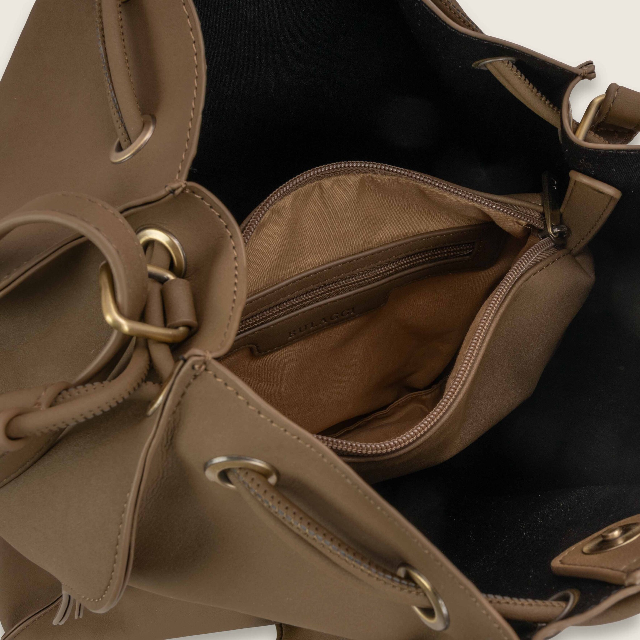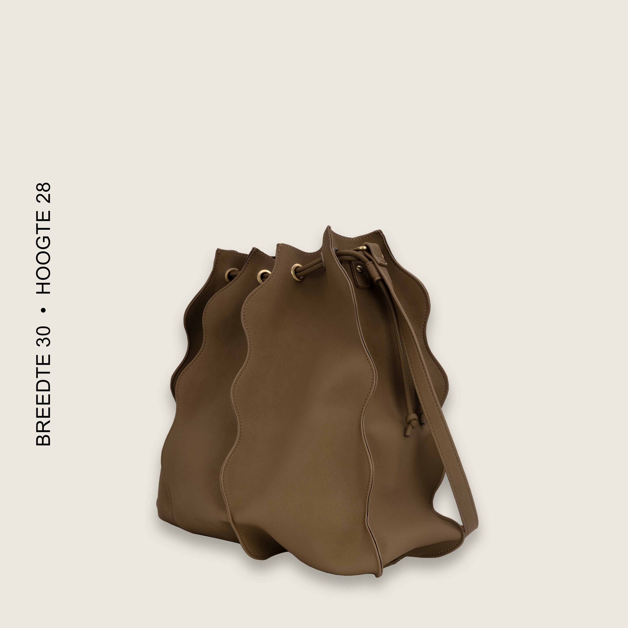 This striking Khaki , meets all expectations of this season's trends. The bag can be carried over the shoulder with a handle. The bag has a main compartment and two inner pockets, of which one with a zipper. The bag closes with a drawstring cord closure. The colour of the hardware is called 'antique brush' and has a messing colour, like polished gold. The sizes (widht x height x depth) of this bag are 30x28