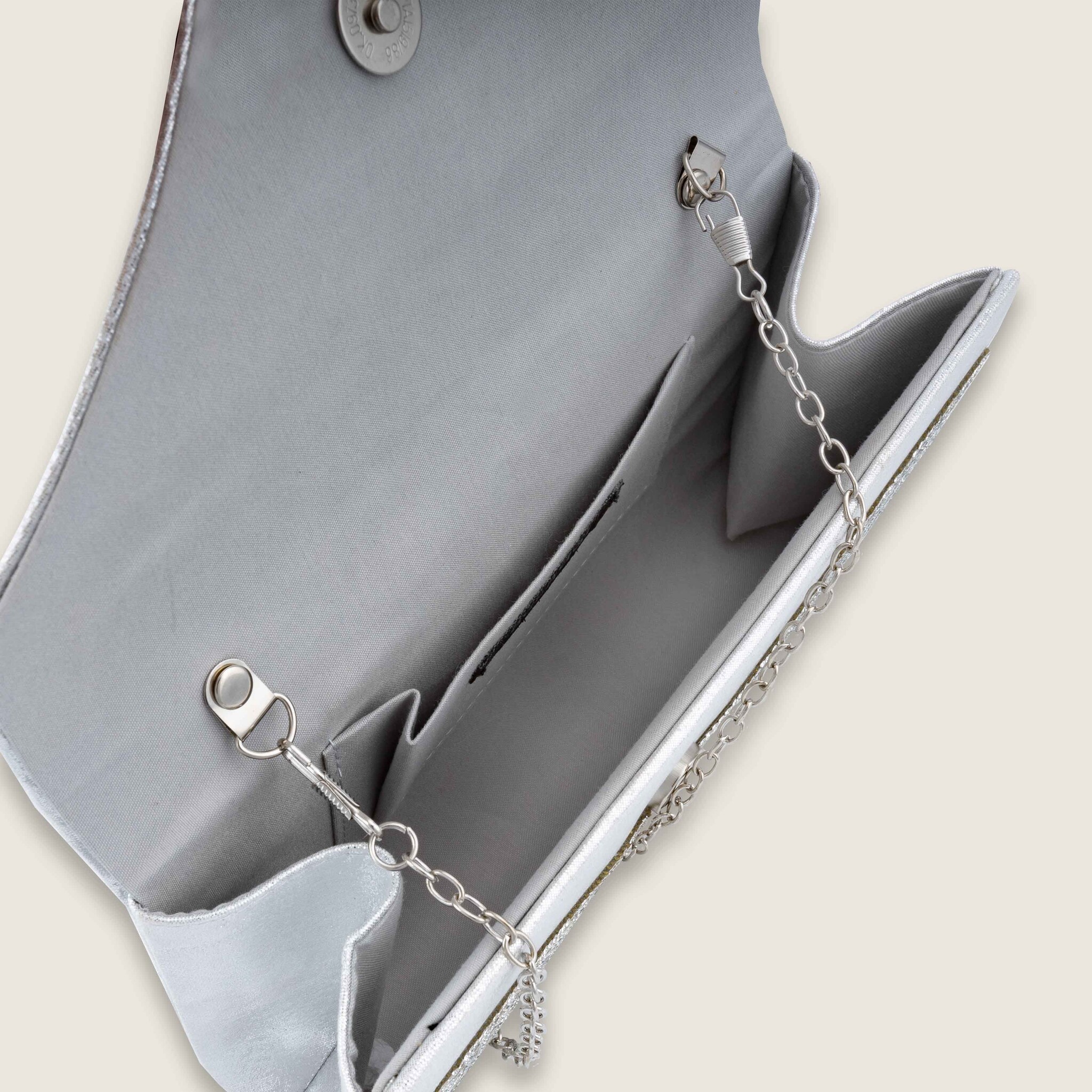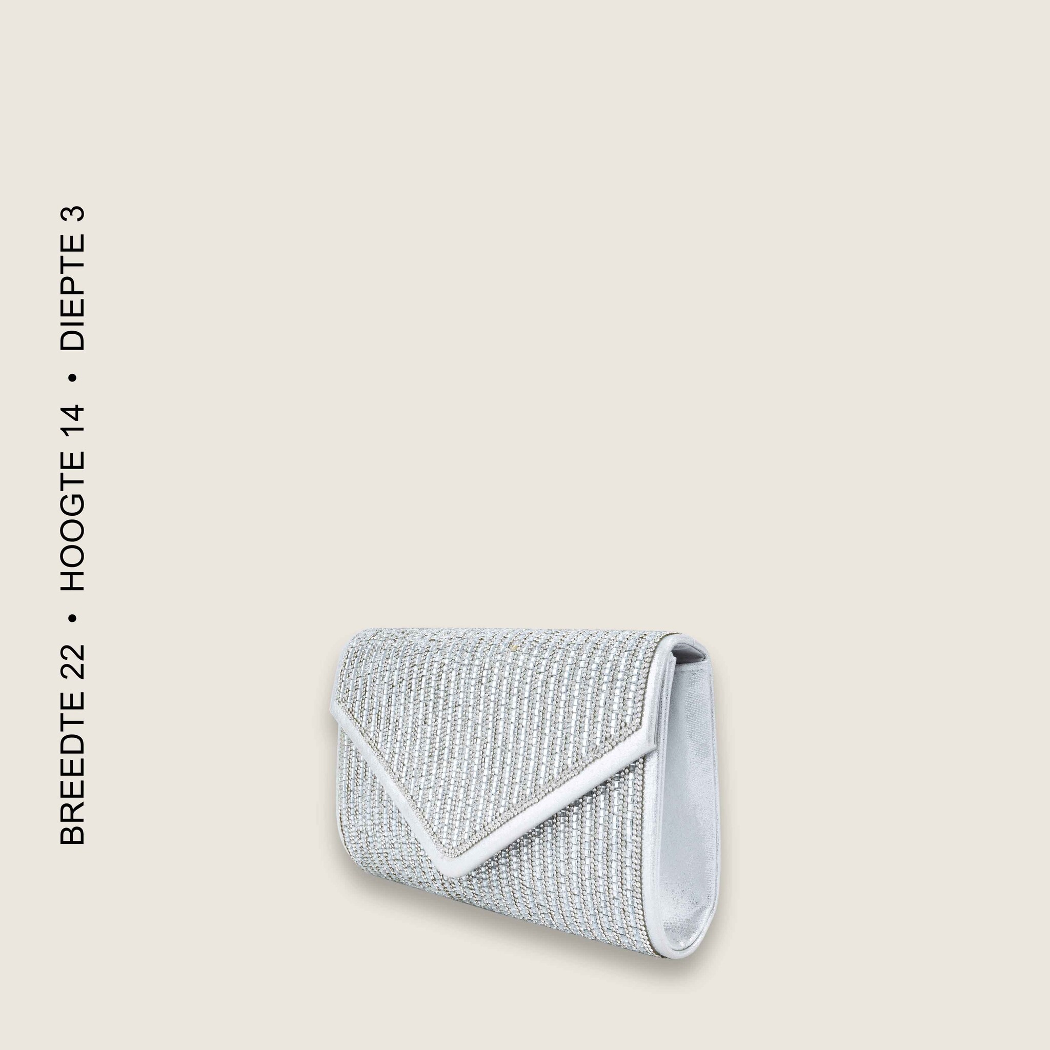 Deze stijlvolle zilveren Britt envelop, is compact, maar wel superhandig. Je kunt er al je essentials in kwijt. Deze clutch wordt geleverd met een verstelbare schouderriem, zodat je de tas niet alleen in de hand hoeft te dragen. Deze tas kan ook over de schouder worden gedragen dankzij de meegeleverde extra schouderriem. Aan de binnenkant heeft deze tas een hoofdcompartiment met één binnenvakje. De tas sluit met een overslag en een drukknop. De metaalkleur is zilver. De afmetingen (breedte / hoogte / diepte) van deze Britt envelop zijn22x14x3