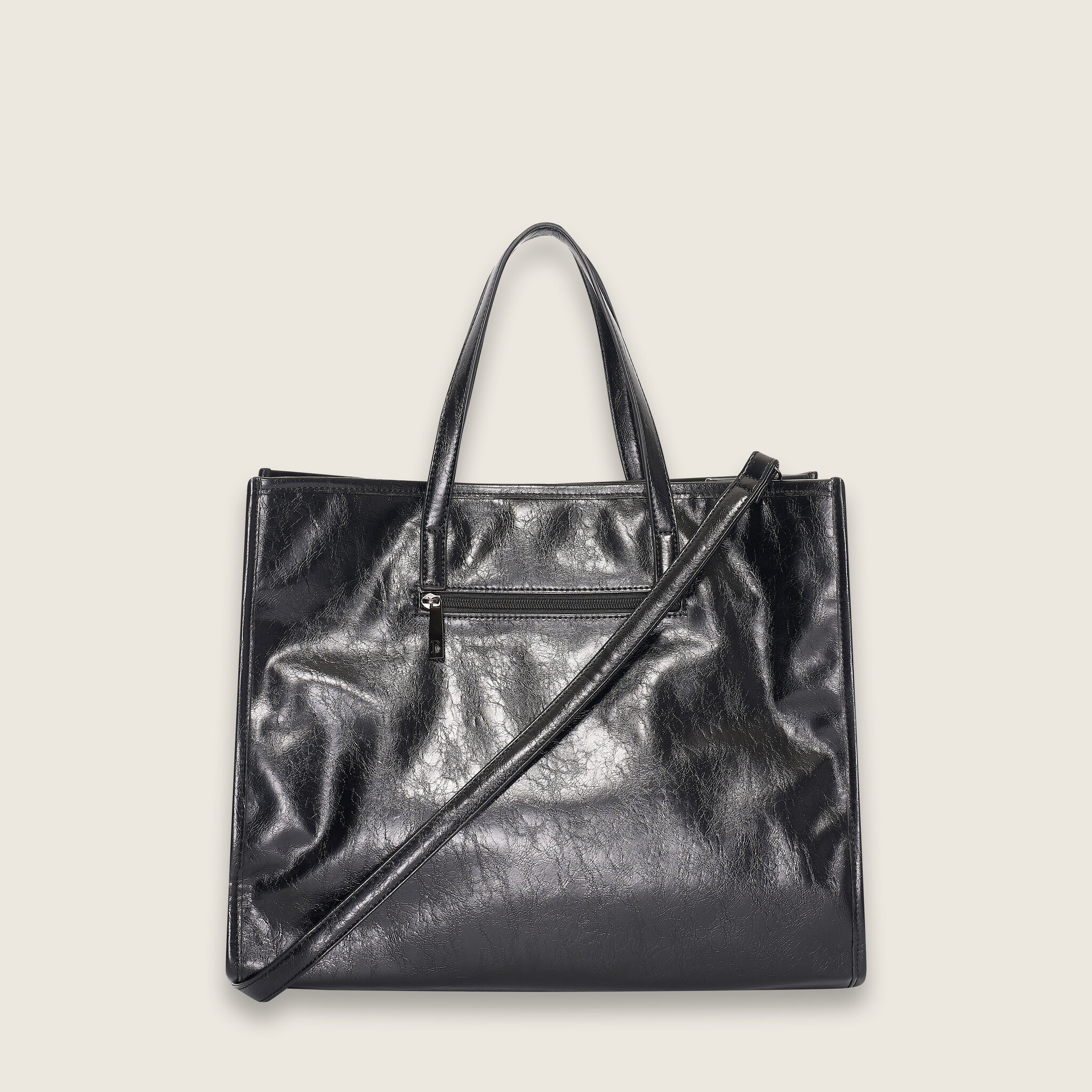 Deze stijlvolle zwarte Crinkle shopper , is een elegante tas die voor veel verschillende gelegenheden te gebruiken is. Deze shopper heeft dubbele (niet verstelbare) hengsels die je prettig op de schouders draagt. Door de bijgeleverde schouderband is deze tas gemakkelijk op diverse manieren te dragen. Aan de binnenkant heeft deze tas een hoofdcompartiment met twee binnenvakjes, waarvan één met rits. De tas kan worden afgesloten middels een rits. De metaalkleur is een donkere, antraciete kleur. De afmetingen (breedte / hoogte / diepte) van deze tas zijn 42x34x21