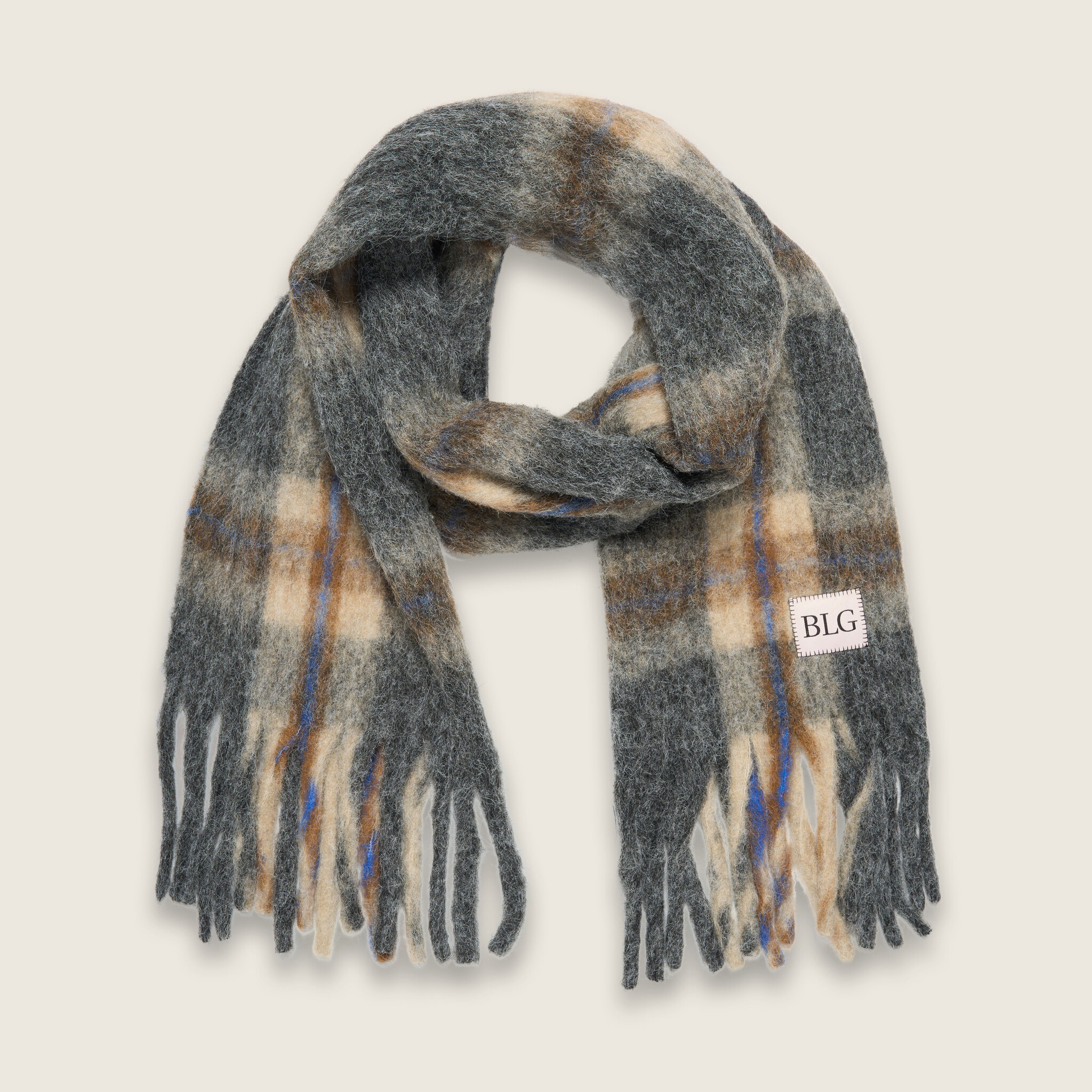 Grijze camel en ecru kleurige shawl gemaakt van 10% wol, 23% nylon en 67% polyester. De shawl heeft een afmeting van 38 bij 180 cm.