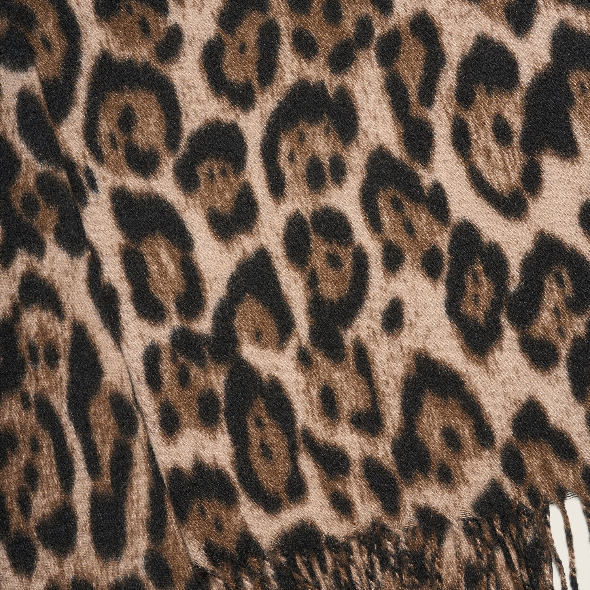 ProductomschrijvingCamel shawl met panterprint gemaakt van 100% polyester met een afmeting van 67 bij 175 cm.
