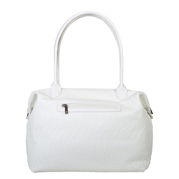 Deze vrouwelijke witte shopper Lizzie is door de geplooide stof een opvallende verschijning. De shopper heeft een ruim hoofdcompartiment en drie binnenvakjes waarvan één afsluitbaar met rits. De tas sluit met een rits. De schoudertas kan makkelijk worden gedragen aan de stevige handvatten. De afmetingen (breedte x hoogte x diepte) van deze tas zijn 31 x 30 x 18 cm.