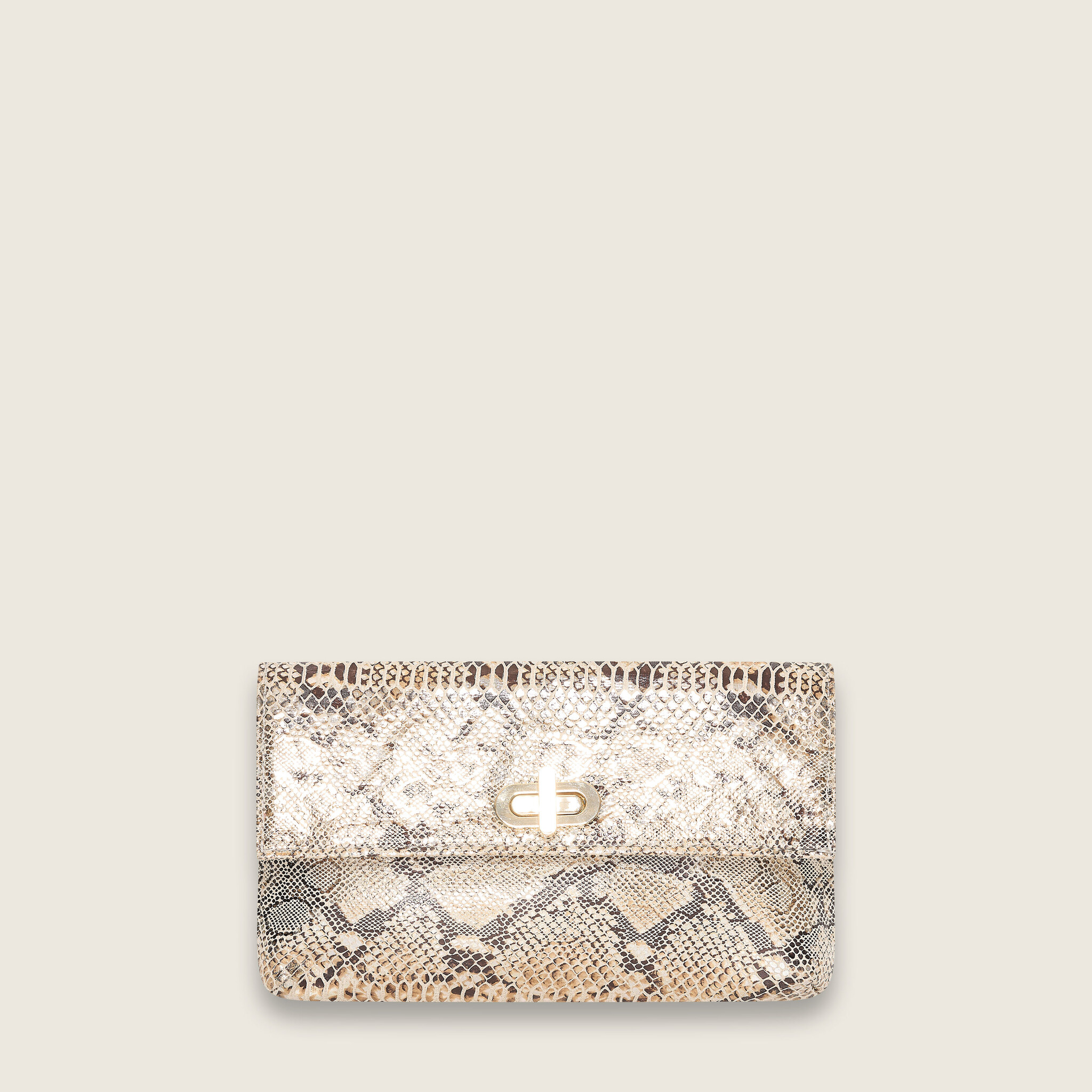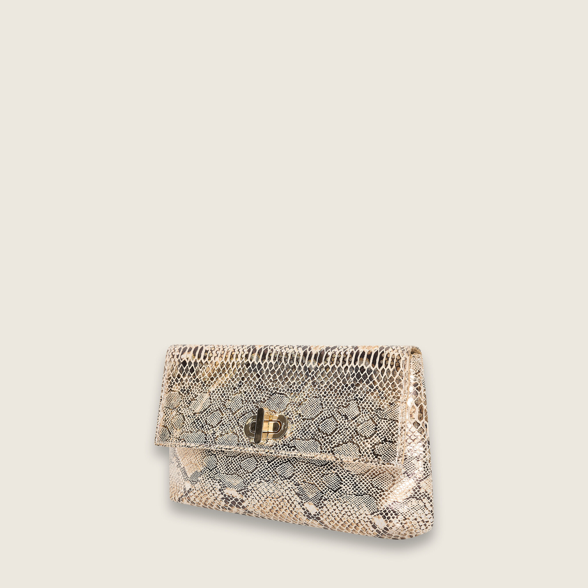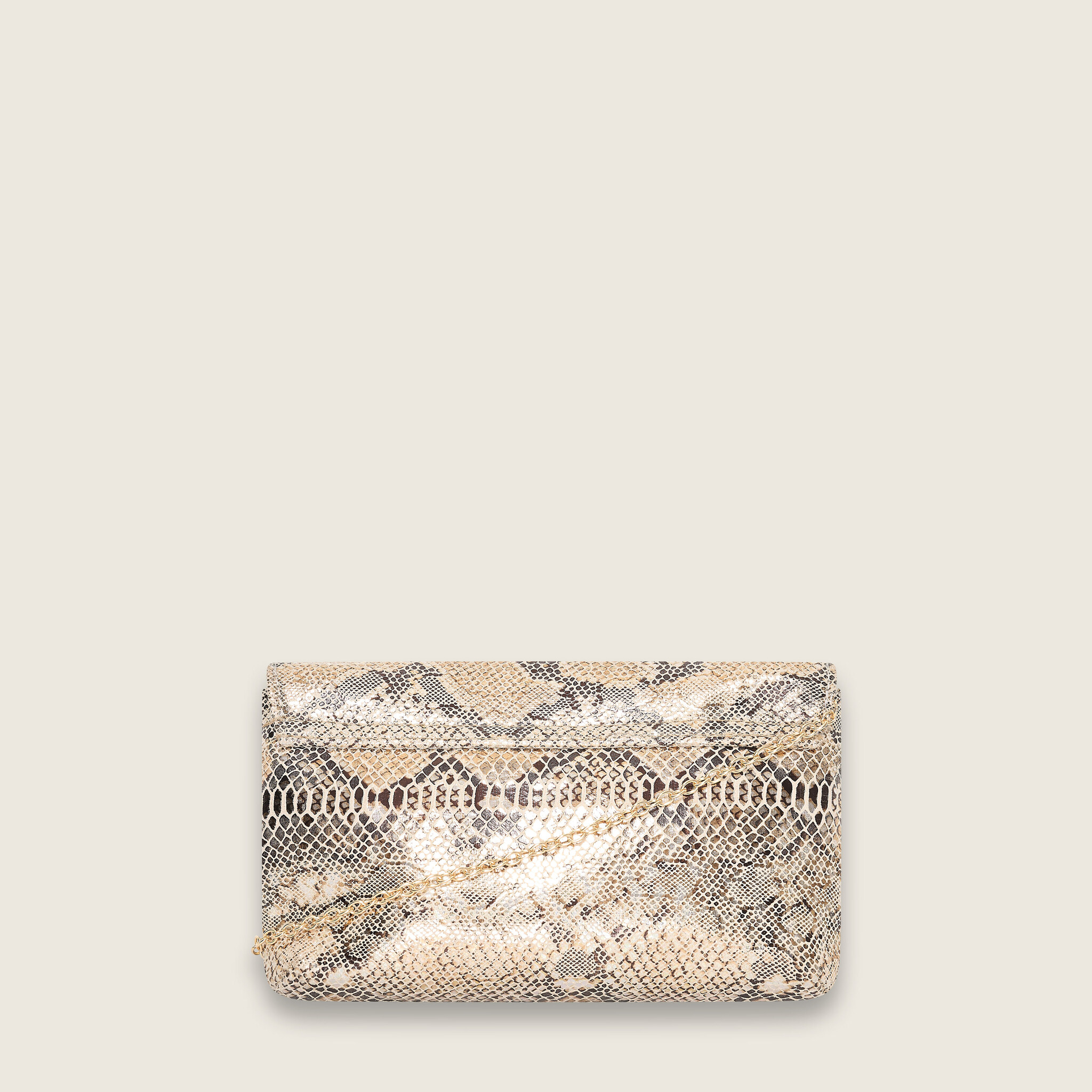 Deze rijk uitziende creme kleurige Snake clutch , is een stijlvolle tas met een te gekke print. De crossbody tas heeft een niet verstelbare schouderketting. Dankzij de extra meegeleverde lange (verstelbare) en afneembare schouderriem, kan de tas op verschillende manieren worden gedragen. Aan de binnenkant heeft deze tas een hoofdcompartiment met één binnenvakje. Middels een overslag en sierlijke sluiting aan de voorkant kan de handtas worden afgesloten. De metaalkleur is goudkleurig. De afmetingen (breedte / hoogte / diepte) van deze tas zijn 25x16x3